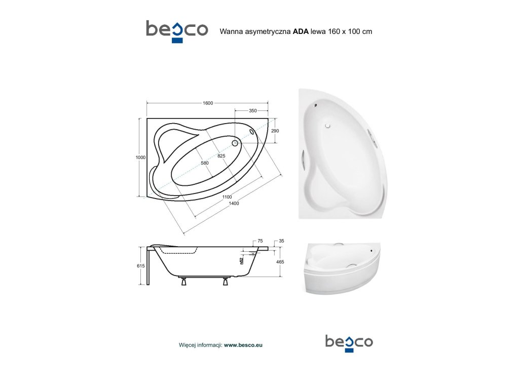 Besco ADA 160 cm VANADA160L+OLVPINOZ vana vč. nožiček levá