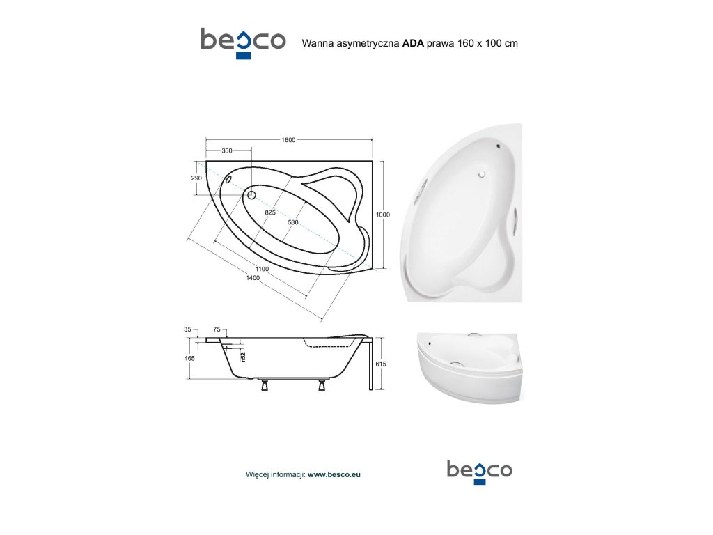 Besco ADA 160 cm VANADA160P+OLVPINOZ vana vč. nožiček pravá