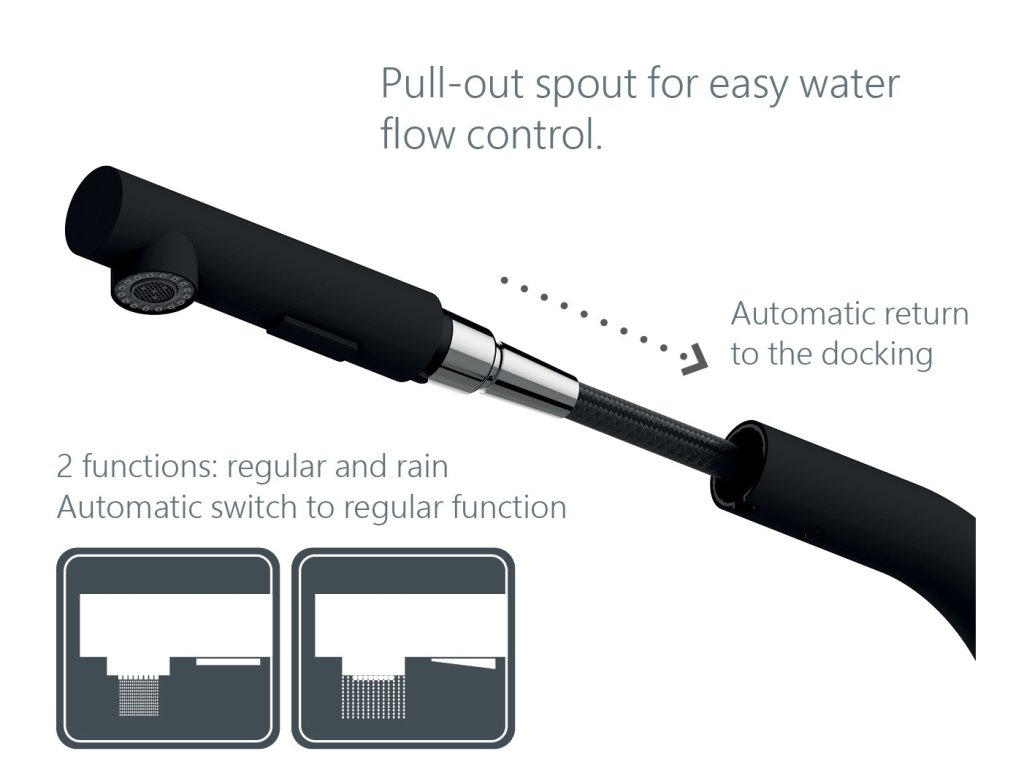 - Výsuvná 2-polohová sprška vám nabízí vysokou flexibilitu při čištění pánví, hrnců a každého rohu dřezu. Díky velkému rozsahu pohybu můžete bez omezení plnit nádoby jakéhokoli typu a velikosti.