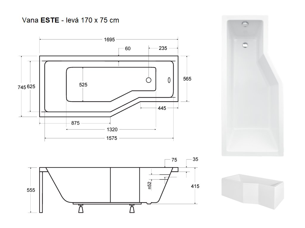 Besco ESTE 170 x 75 cm VANEST17L+OLVPINOZ vana vč. nožiček levá