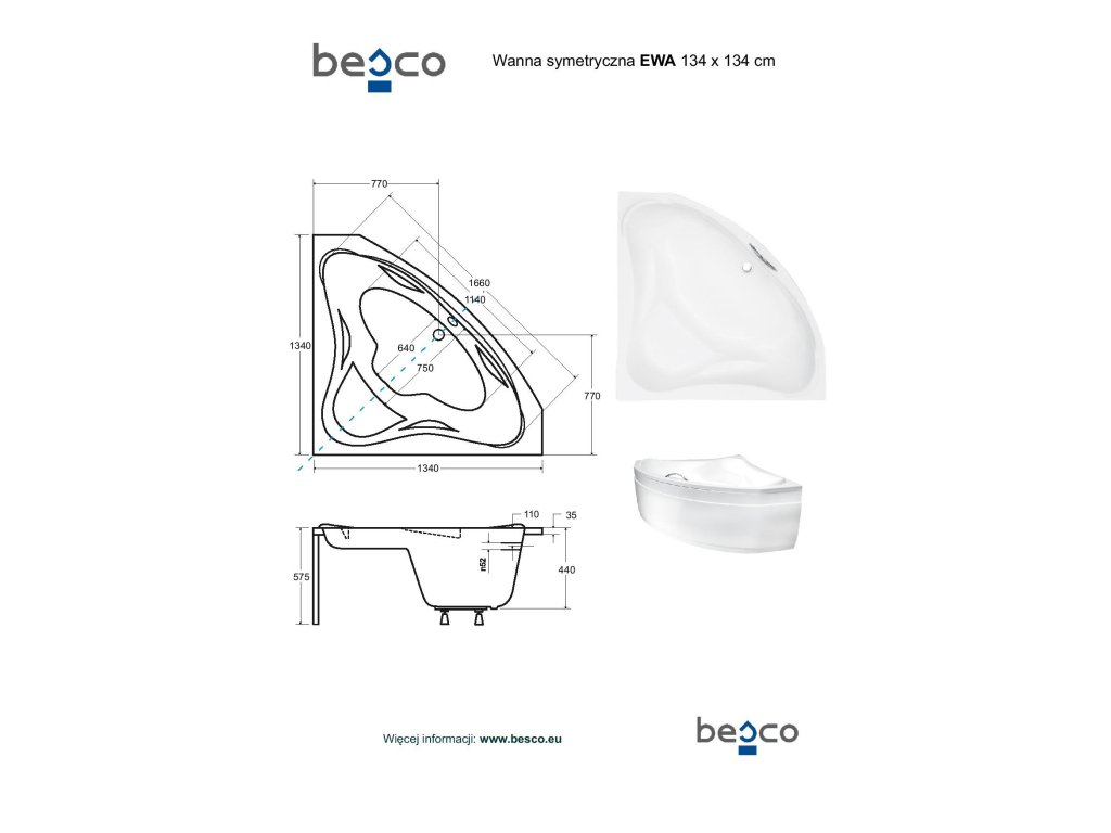 Besco Ewa rohová vana 134 x 134 cm s nožičkami bílá VANEWA135+OLVPINOZSTELWD