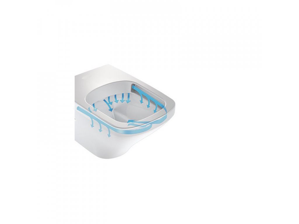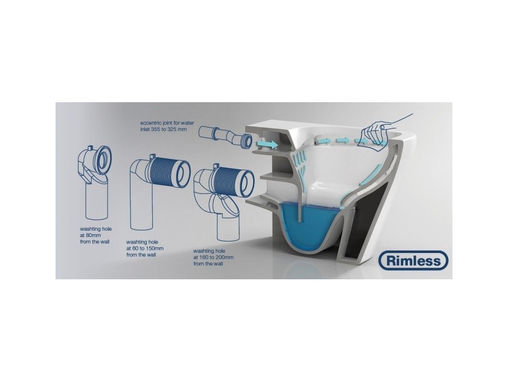 Systém RIMLESS je revoluční bezokruhovým splachováním exkluzivně u tohoto WC kombi. Tradiční wc klozety mají pod okrajem velmi obtížně přístupná místa, v nichž se shromažďují nečistoty a bakterie. S inovativní technologií RIMLESS byl tento problém vyřešen – ze záchodové mísy byl odstraněn vnitřní „límec“ a tedy i obtížně přístupná místa. Nyní při splachování voda oplachuje všechny vnitřní plochy mísy a snadno se také dostane ke všem vnitřním plochám, mísa je tak vždy dokonale čistá. WC není celokapotované z důvodu jednoduššího připojení spodního napouštění (viz. technický nákres).