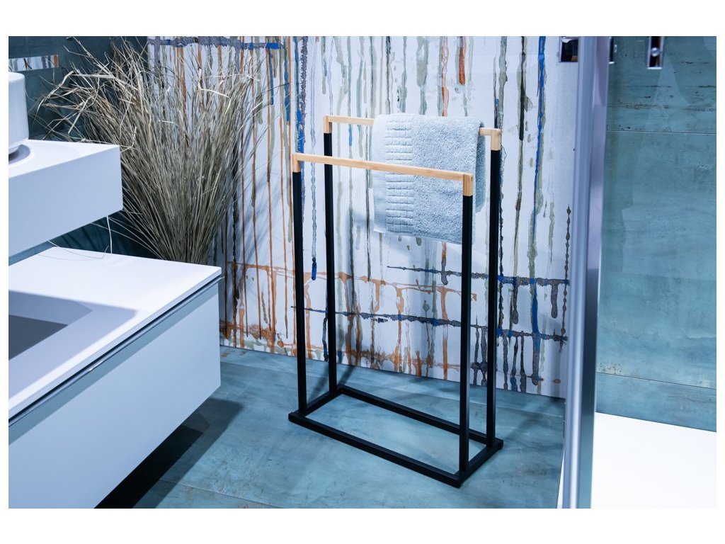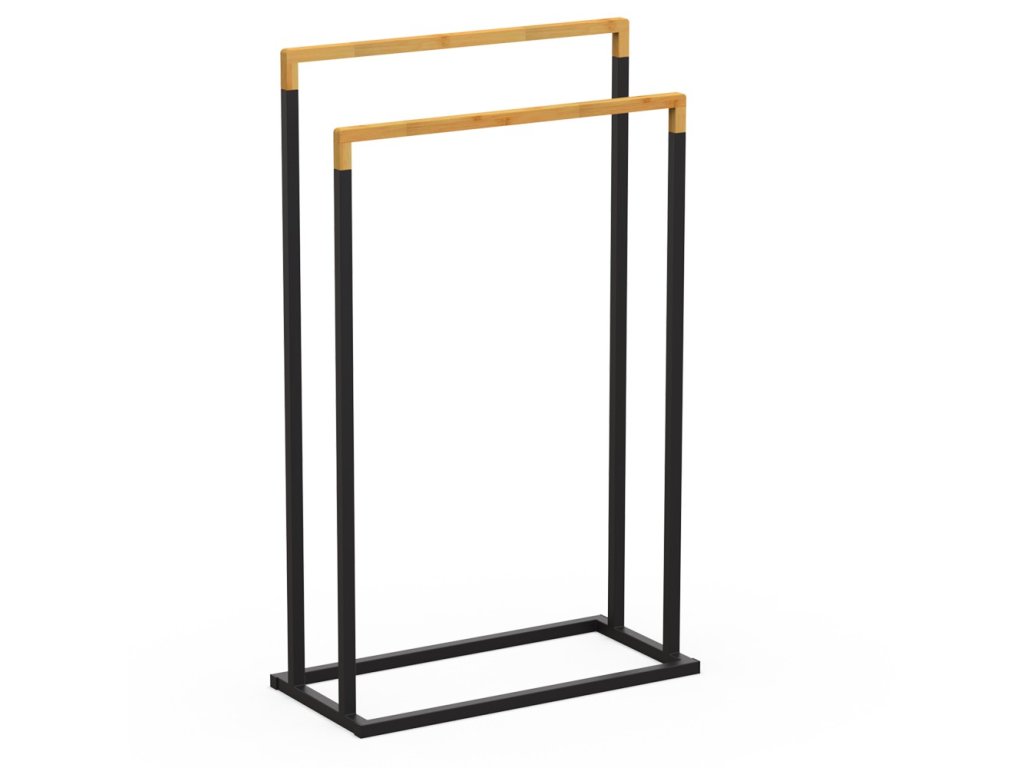 Moderní stojací věšák na ručníky se dvěma rameny navržený v jednoduché geometrické formě. Byla vyrobena z oceli lakované černě s matným povrchem a na výrobu horních ramen bylo použito přírodní bambusové dřevo. Věšák na ručníky má stabilní základnu zajištěnou plastovými nožičkami. Výrobek vyžaduje vlastní montáž.