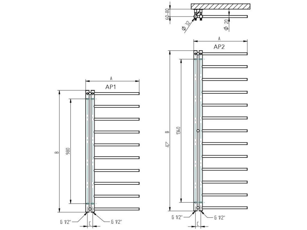Radiátor Apollo od firmy PMH. Radiátor nabízí výhodu zavěšení ručníků ze strany nebo pomocí háčků, které jsou umístěny na 2 vertikálních trubkách.