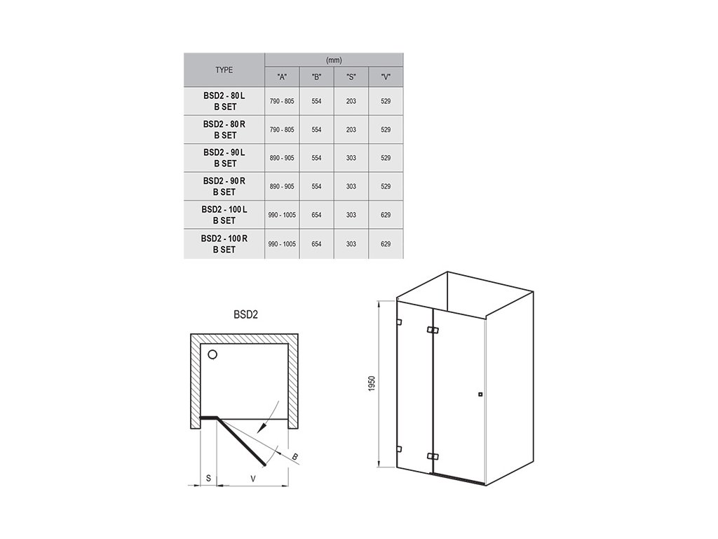Výrobek se skládá ve dvou pevných dílů, z nichž jeden díl tvoří otočné dveře. Levá nebo pravá varianta výrobku je dána umístěním pantů otočných dveří při pohledu zvenku. Levý sprchový kout se kombinuje pouze s B SET v levém provedení a Pravý sprchový kout se kombinuje pouze s B SET v pravém provedení.