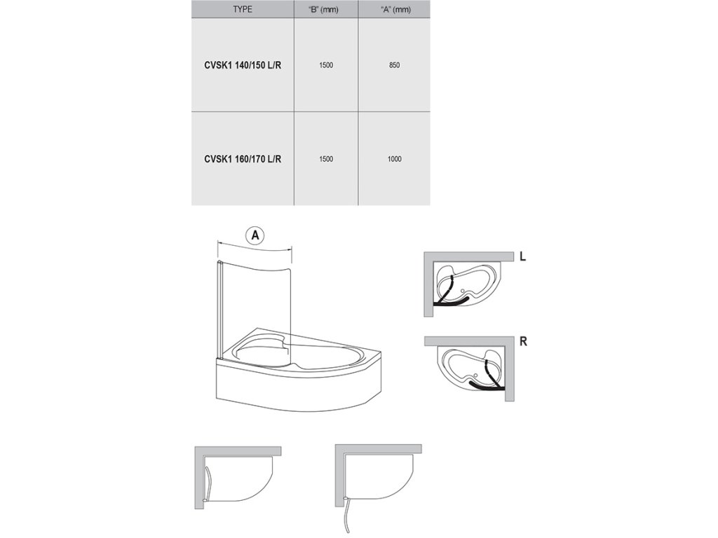 vanová zástěna jednodílná pohyblivá k vanám Rosa I, II, 95 v rozměrech 140/150/160/170 cm: L/P, barva bočního profilu: bílá, lesk, satin, výplň z bezpečnostního skla: transparent, výška výrobků je 1500 mm "- rozměry: 85 cm pro vany 140, 150 cm: 100 cm pro vany 160, 170 cm