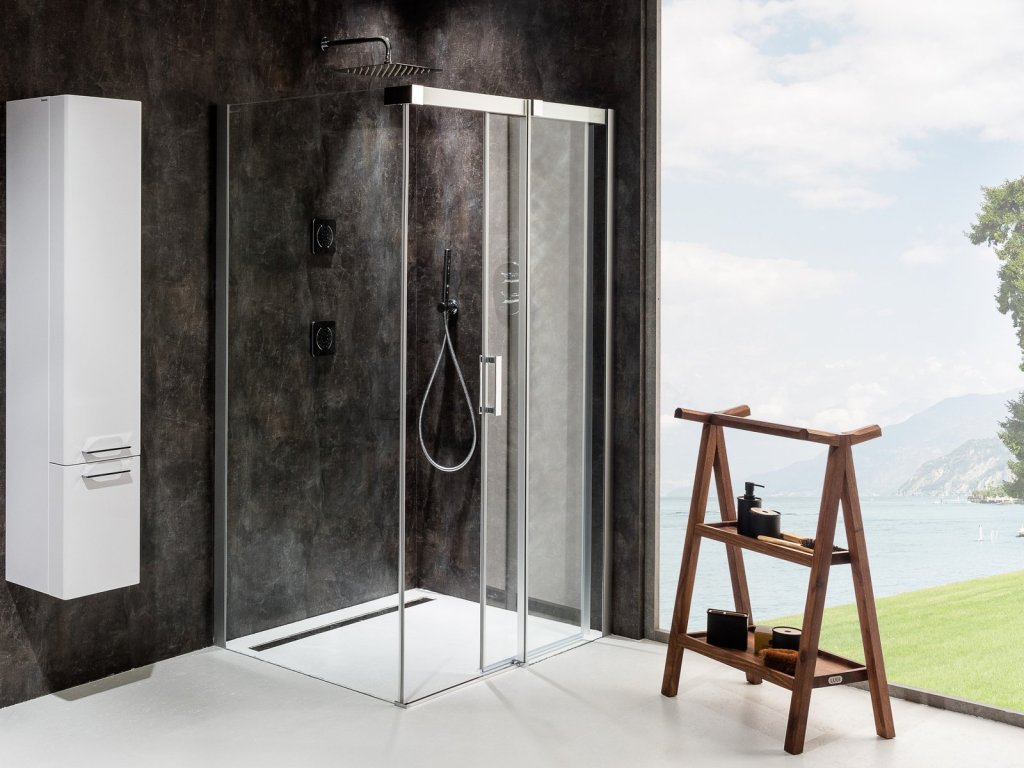 Výrobek se skládá ze sprchových dveřích dvoudílných (s jedním pevným dílem a s jedním pohyblivým, který tvoří posuvné dveře) a z pevné stěny jednodílné. Levá nebo pravá varianta výrobku je dána směrem otvírání posuvných dveří při pohledu zvenku. Montuje se do obloženého rohu koupelny přímo na podlahu se zabudovaným odtokovým žlabem či podlahovou vpustí.