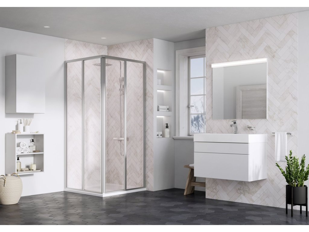 Sprchový kout rohový posuvný čtyřdílný v rozměrech 75, 80, 90, 100 cm. Provedení rámu: bílá/satin/černá, výplň z umělé hmoty: pearl, výplň z bezpečnostního skla: transparent/grape, k vytvoření celého koutu jsou zapotřebí dva kusy posuvných dveří SRV2-S, výška výrobku 1950 mm "- rozměry: 75, 80, 90, 100 cm