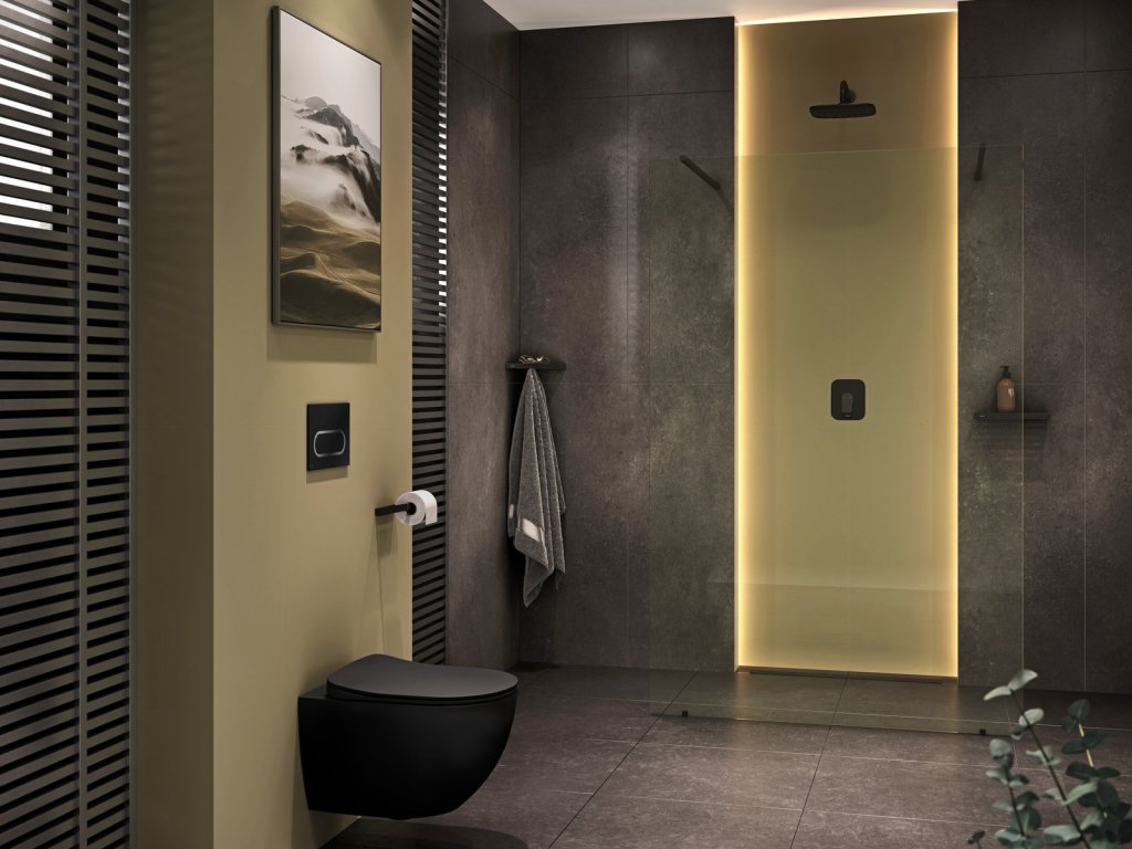 - doplňky k dokoupení: černé WC sedátko Uni Chrome Flat, černé ovládací tlačítko Chrome, instalační splachovací moduly