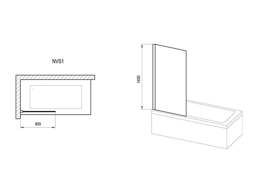vanová zástěna jednodílná pevná k obdélníkovým vanám s rovným horním lemem v rozměru 80 cm: provedení profilu: bílá/satin/lesk/černá, výplň z bezpečnostního skla: transparent, zástěna se skládá z jedné pevné části, se kterou nelze manipulovat, výška výrobků je 1400 mm "- rozměry: 80 cm