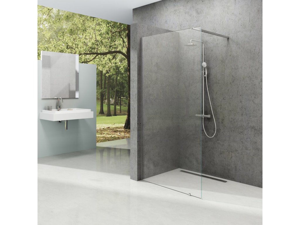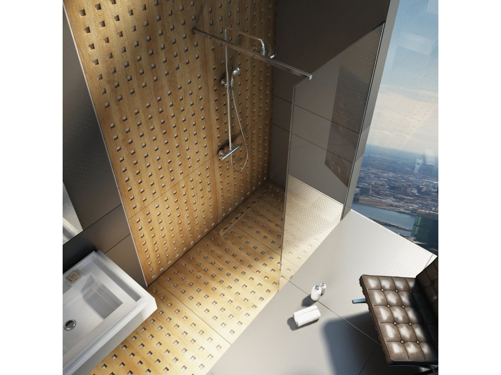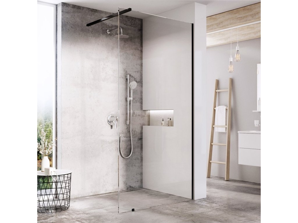 Zvolenou šířku sprchovacího prostoru pak uzavírá boční skleněná pevná stěna Walk-In Wall, která by měla být shodného rozměru. Tuto skleněnou stěnu zajišťuje spojovací kovová vzpěra – W SET-Uni T spoj o délce 1200 mm, která se montuje na první vzpěru, a díky ní si zvolíte šířku vstupu do sprchovacího prostoru (max. 110 cm). V případě potřeby lze i tuto vzpěru zkrátit.