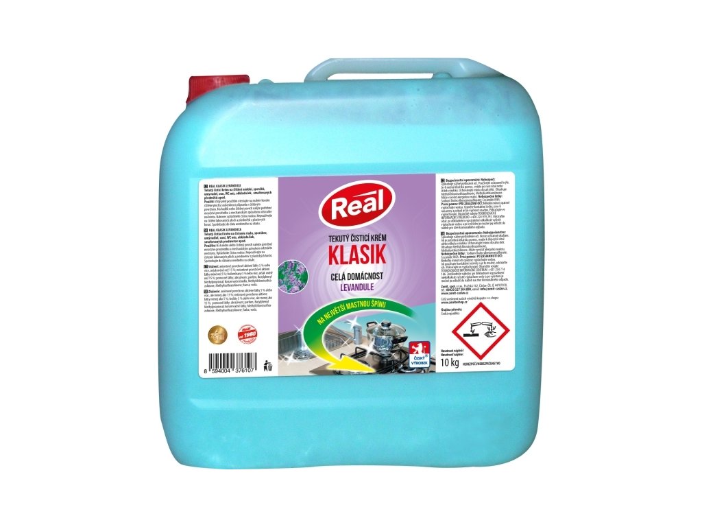 Real Klasik spojuje sílu čisticího prášku s jemností krému, je šetrnější než prášek a přitom univerzální a spolehlivě silný. Bez velké fyzické námahy umyje i silně ušpiněné povrchy, které nelze očistit běžným způsobem. Vedle tradičního široké použití v domácnosti získává přípravek díky své všestrannosti a účinnosti stále větší spektrum užití v úklidových firmách i v průmyslu. Mírná parfemace uspěje u každého náročného uživatele.