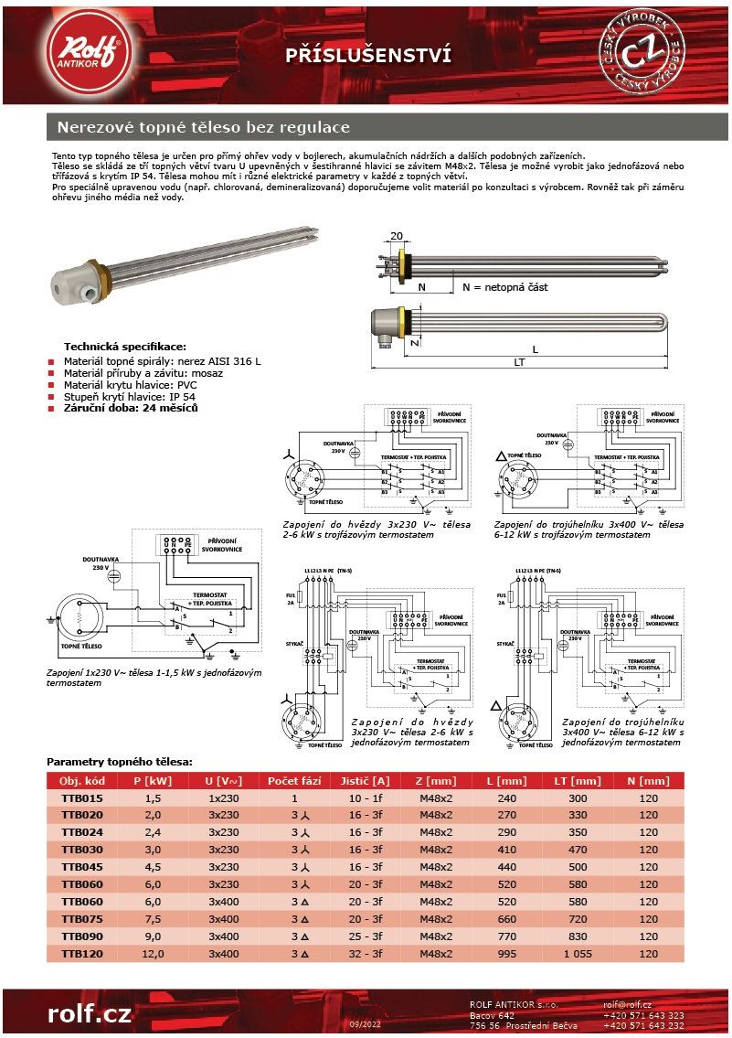 Rolf 7,5 kW, L=660 mm elektrické topné těleso nerezové bez regulace TTB075