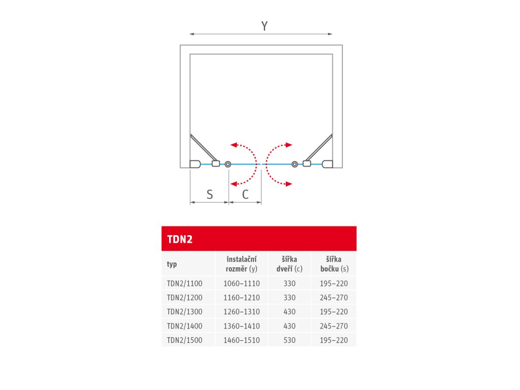 TDN2 jsou dvoukřídlé sprchové dveře pro instalaci do niky. Tyto sprchové dveře mohou být velice pěkným řešením pro vaši koupelnu.