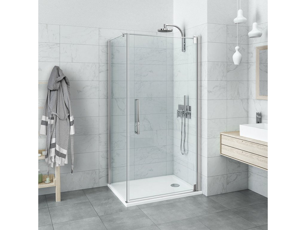 Kout je možné kombinovat ze  tří  standardních velikostí dveří i pevné stěny, které jsou univerzálně instalovatelné (při objednání neřešíte, co bude vpravo a co vlevo).  Vytvořte si tak čtvercový nebo obdélníkový kout na míru vašim představám a  prostoru.