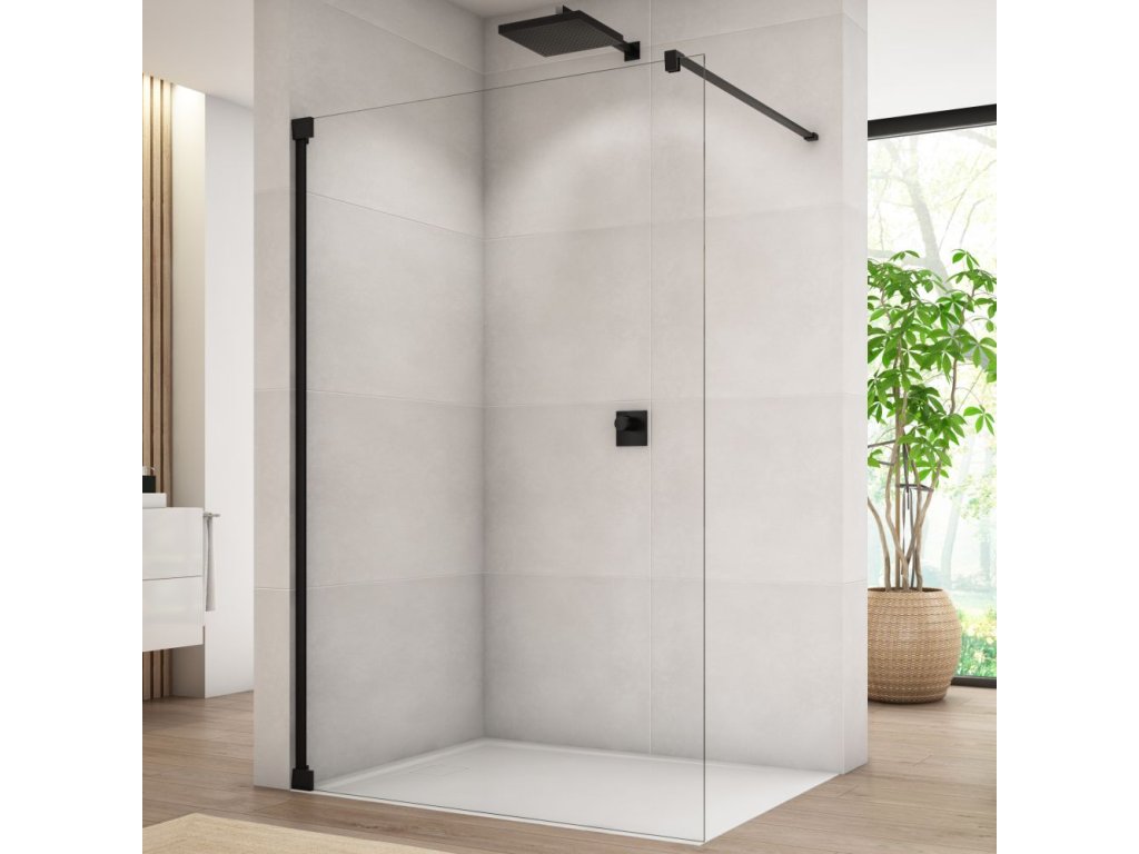 Walk-in zástěna CADURA BLACK LINE – pevná stěna samostatná s vyrovnávacím profilem je aktuálním trendem pro moderní koupelny. 6mm bezpečnostní čiré sklo je pokryto antiplakovou úpravou AQUAPERLE pro eliminaci vodního kamene na skle Walk-in zástěny. Celková výška včetně vodorovné vzpěry je 2024 mm. Walk-in zástěnu CAT4 lze použít samostatně nebo v kombinaci s boční stěnou CAT3. Všechny pohledové dílky jsou v černé matné barvě.Doplňkové parametry