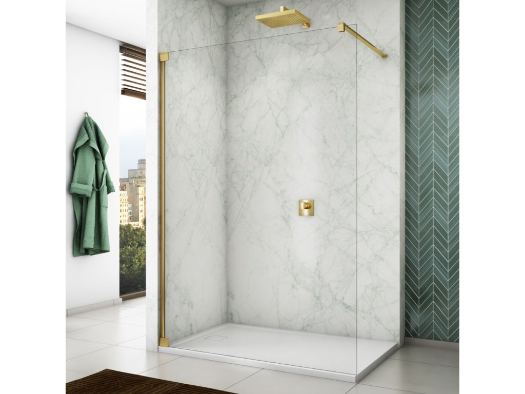 Walk-in zástěna CADURA GOLD LINE – pevná stěna samostatná s vyrovnávacím profilem je aktuálním trendem pro moderní koupelny. 6mm bezpečnostní sklo je pokryto antiplakovou úpravou AQUAPERLE pro eliminaci vodního kamene na skle Walk-in zástěny. Dekor skla 87 - Screen. Celková výška včetně vodorovné vzpěry je 2024 mm. Walk-in zástěnu CAT4 lze použít samostatně nebo v kombinaci s boční stěnou CAT3. Všechny pohledové dílky jsou ve zlaté lesklé barvě.Doplňkové parametry