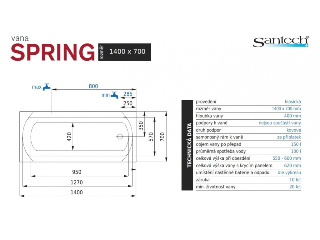 Akrylátová vana Spring se vyznačuje jednoduchými liniemi a asymetrickým uspořádáním koupacího prostoru s přepadovým otvorem v čele vany a s odtokovým otvorem v nožní partii. Zádová část má přiměřený sklon, který slouží k pohodlné relaxaci. Okraje vany jsou na obou čelech mírně zaobleny. Velmi podobnou designovou koncepci má i obdelníková vana Santech LINEA.