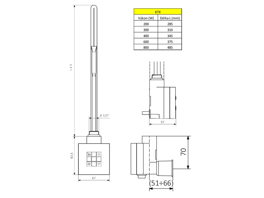 KTX s  krytem pro přímé napojení do zdi  - elektrická topná tyč s  designovým termostatem. Hranatý design vhodný pro všechny typy radiátorů. Symetrické provedení umožňuje instalaci na levou i  pravou stranu radiátoru.