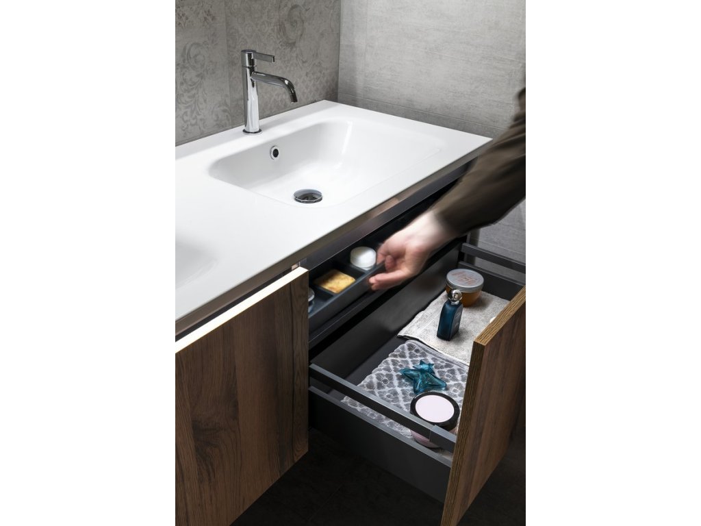 Uvnitř skříňky je nad zásuvkou praktická police na drobnosti každodenní potřeby. Pod hranu umyvadla lze instalovat tlumené LED osvětlení, které pro jeho nízkou spotřebu (1W) není nutné vypínat.