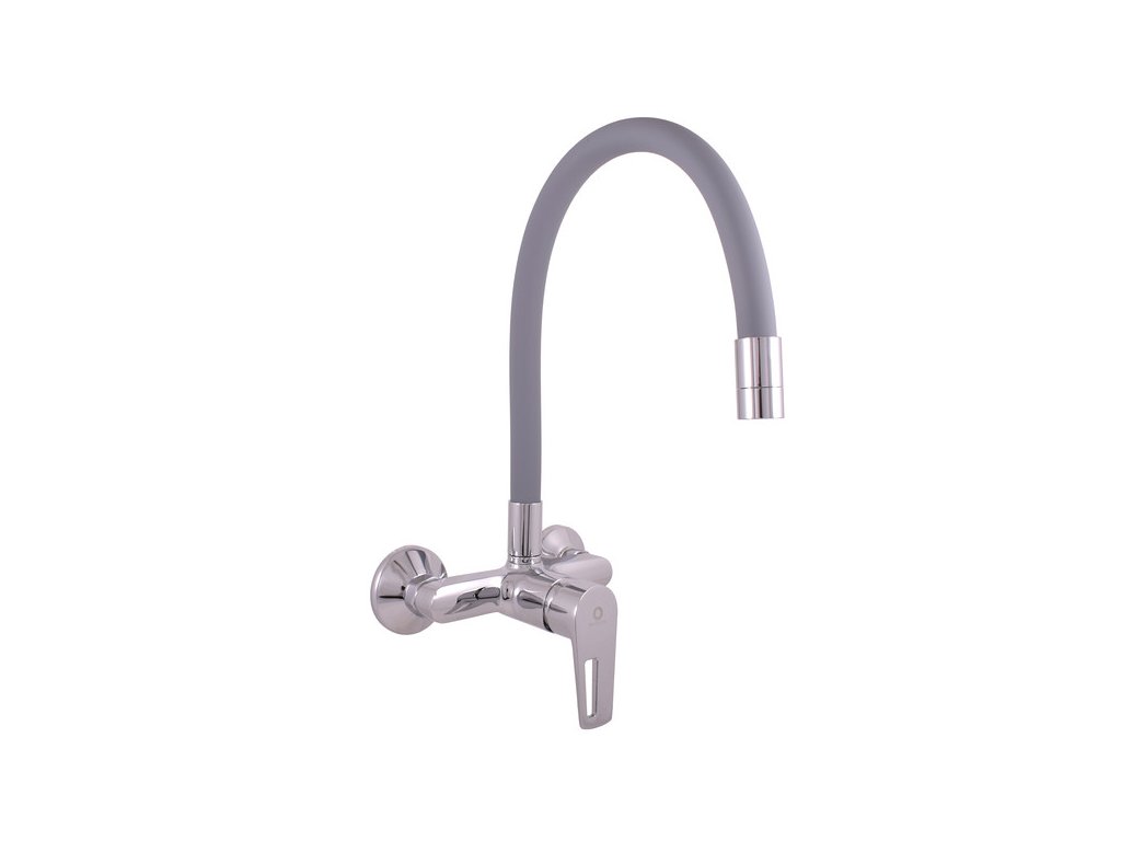 Vodovodní baterie dřezová nástěnná s flexibilním otočným ramínkem.