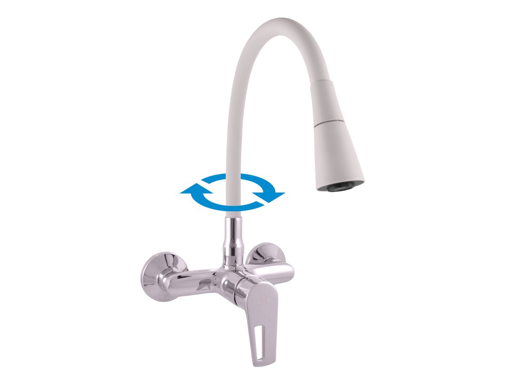Vodovodní baterie dřezová nástěnná s :flexibilním :otočným ramínkem se sprchou.