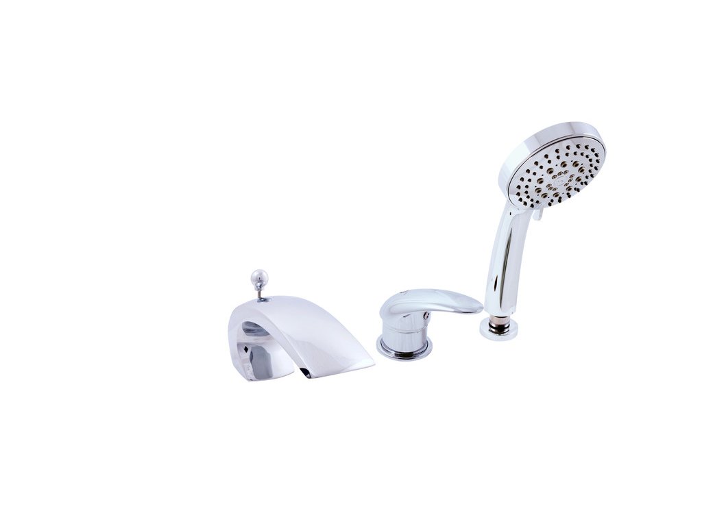 Vodovodní baterie vanová stojánková tříotvorová s přepínačem ve výtoku, samonavíjecí sprchou a 2 m hadicí.