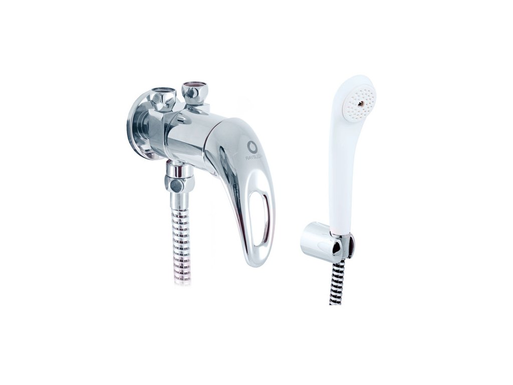 Vodovodní baterie páková sprchová ze zdi, srůžicí, hadicí apevným držákem pro nízkotlaké ohřívače.