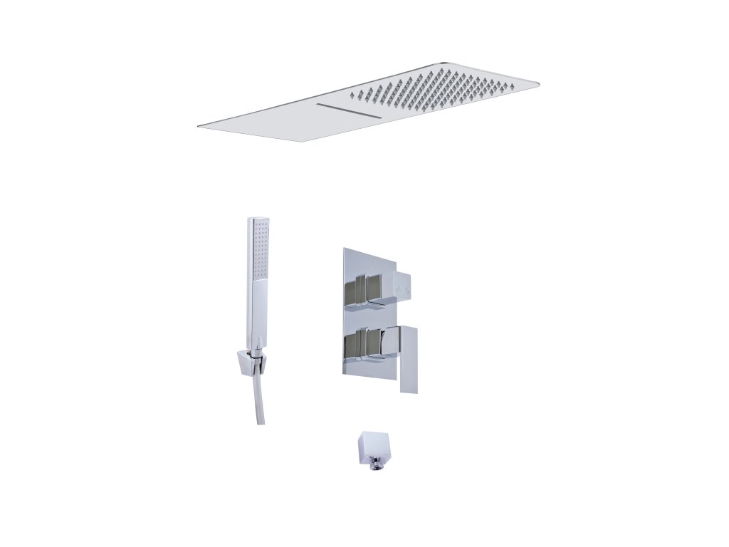 Sprchový komplet včetně vodovodní baterie s třícestným keramickým přepínačem, pevným držákem, ruční sprchou, hadicí a hlavovou sprchou s vodopádem.