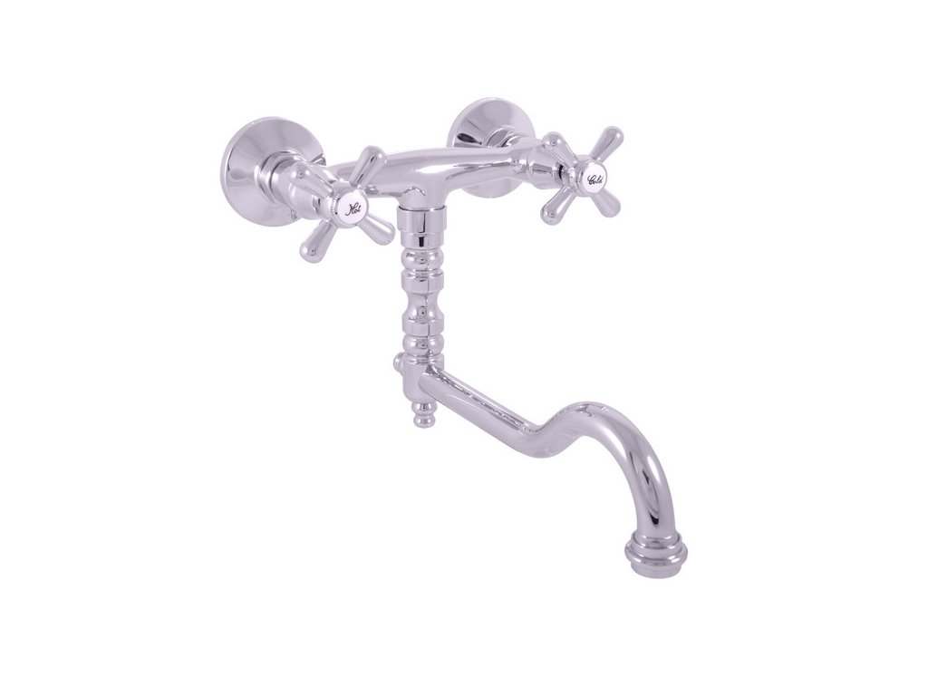 Vodovodní baterie dřezová nástěnná s kulatým otočným ramínkem.