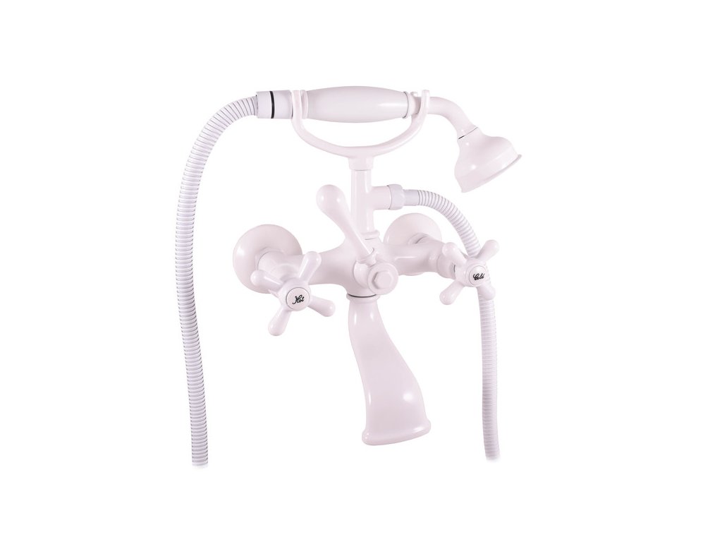 Vodovodní baterie vanová nástěnná s vidlicí na odkládání sprchy a se sprchou.