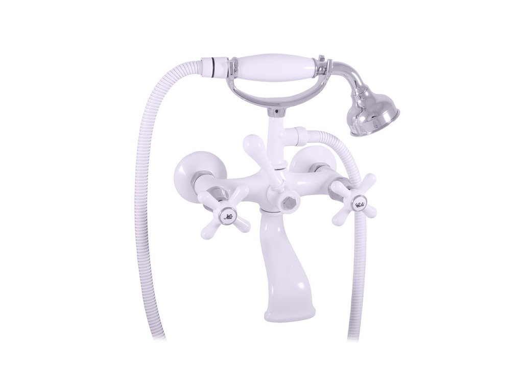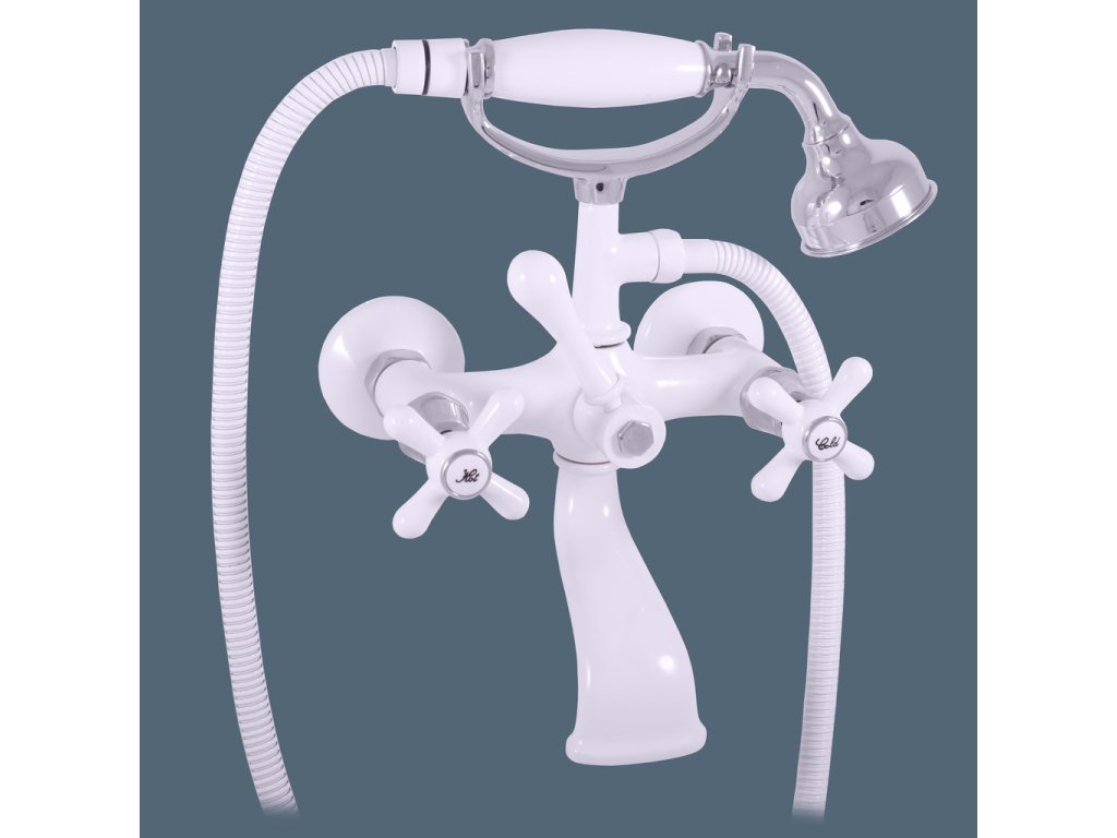 Vodovodní baterie vanová nástěnná s vidlicí na odkládání sprchy a se sprchou.