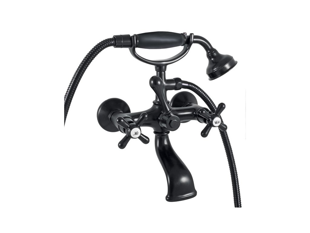 Vodovodní baterie vanová nástěnná s vidlicí na odkládání sprchy a se sprchou.