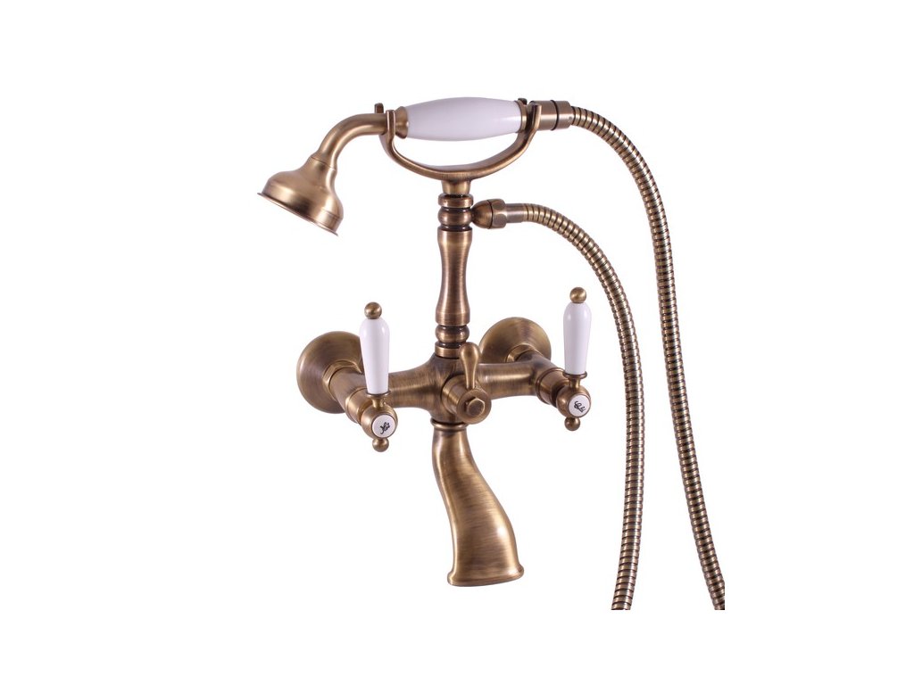 Vodovodní baterie vanová nástěnná s vidlicí na odkládání sprchy a sprchou.