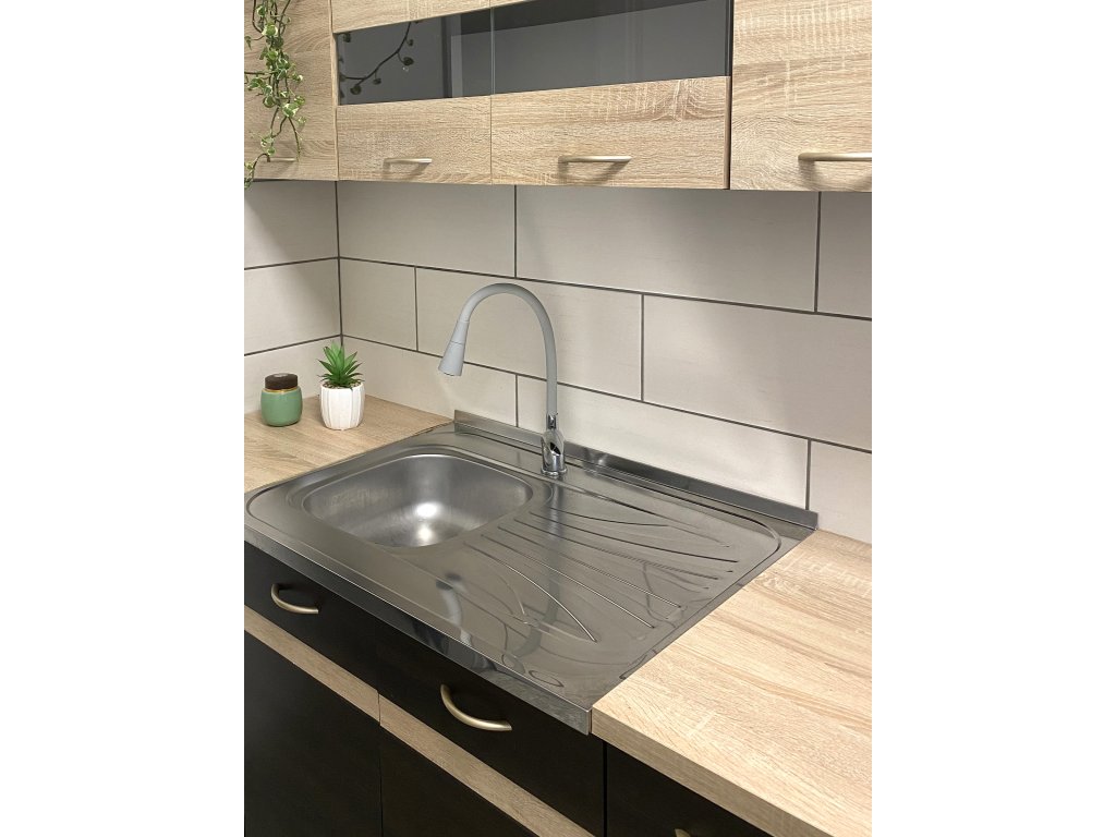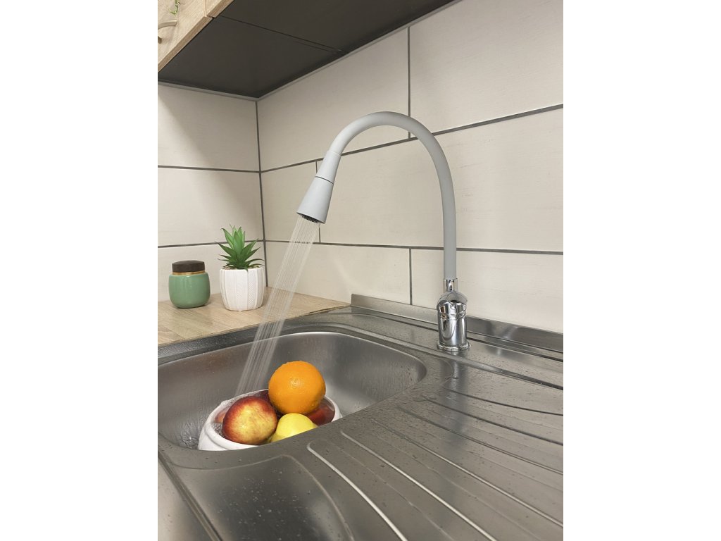 Vodovodní baterie dřezová stojánková s flexibilním otočným ramínkem se sprchou.