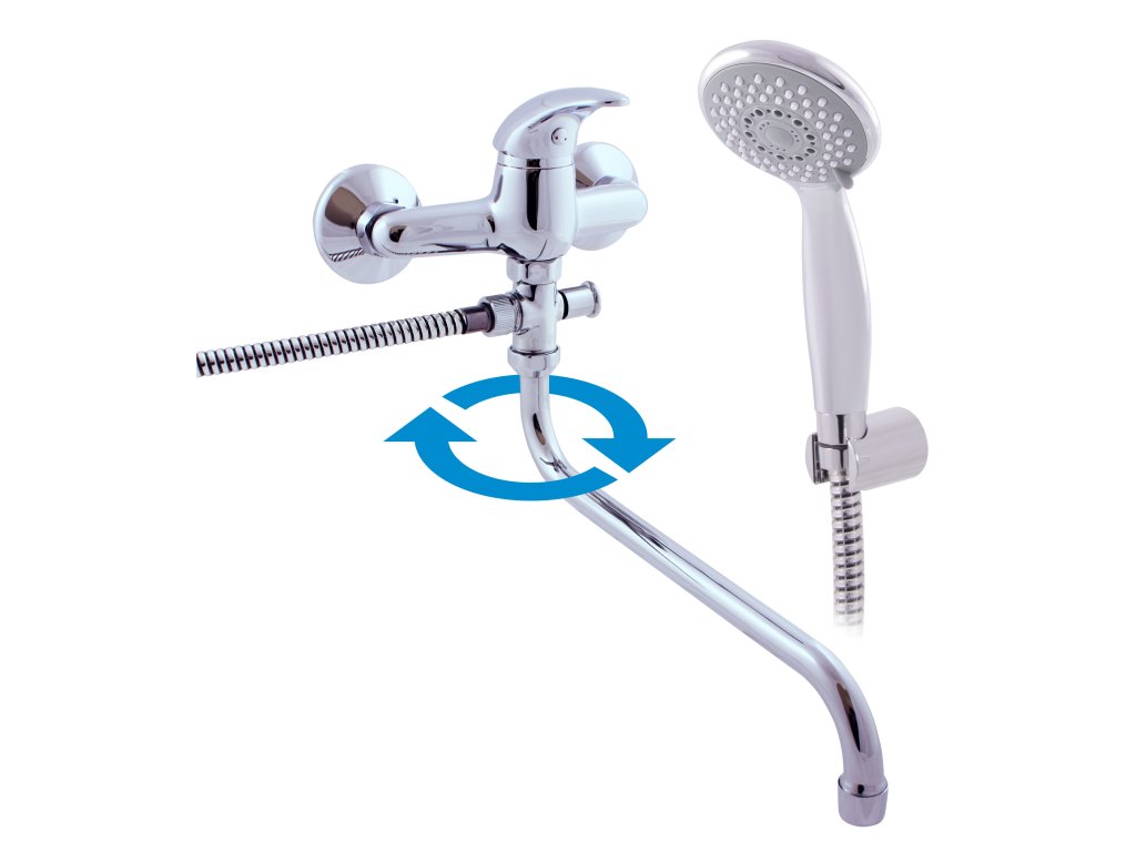 Vodovodní baterie pro vanu a umyvadlo nástěnná s kulatým ramínkem, sprchou a pevným držákem.