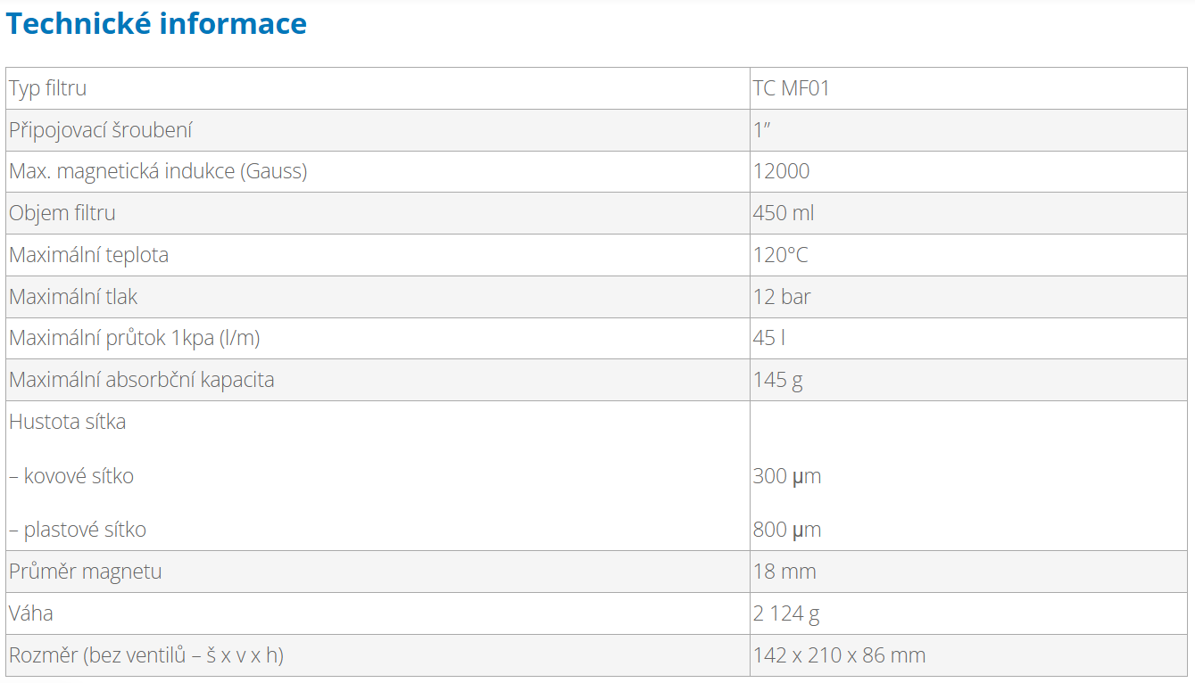Filtr TC MF01 s připojovací šroubením 1” je vysoce účinný plnoprůtokový magnetický filtr navržený pro jednoduchou instalaci, čištění a servis. Je připraven k ochraně všech centrálních topných systémů tím, že odstraní prakticky 100 % suspendovaného oxidu železitého. Filtr má možnost horizontální i vertikální instalace.
