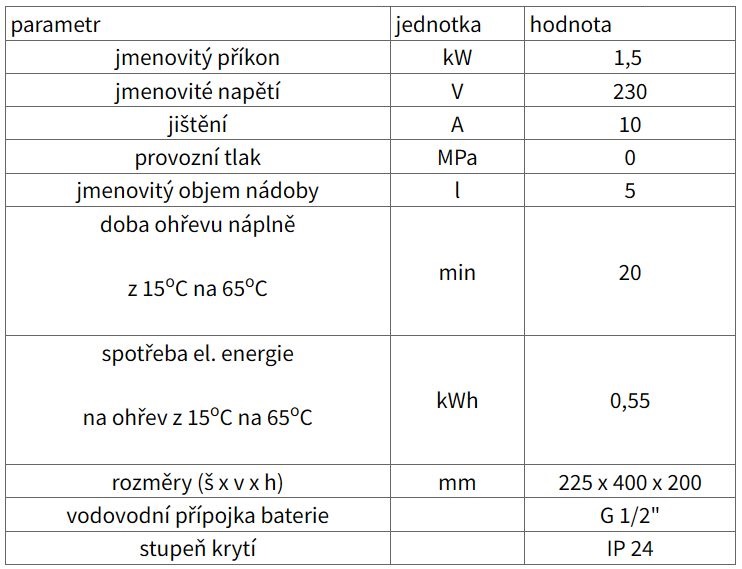 Beztlaký elektrický zásobníkový ohřívač řady FAFU o objemu 5 litrů. Zásobník je konstrukčně řešen plastovou nádobou (beztlakou - výtok z nádoby nesmí být uzavřen). Ohřívač má plastový plášť. Izolaci tvoří polyuretanová pěna, která zaručuje nízké tepelné ztráty. Tento 5-ti litrový zásobník je možno zavěsit na stěnu s vývody orientovanými nahoru nad ohřívač. Ohřívač nabízíme také spolu s příslušnou beztlakou baterií ve dvou různých variantách.